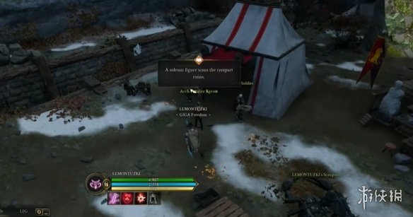 这段对话结束后,找到图中显示的NPC并和他对话,他会让我们进入后面的帐篷里继续交谈。