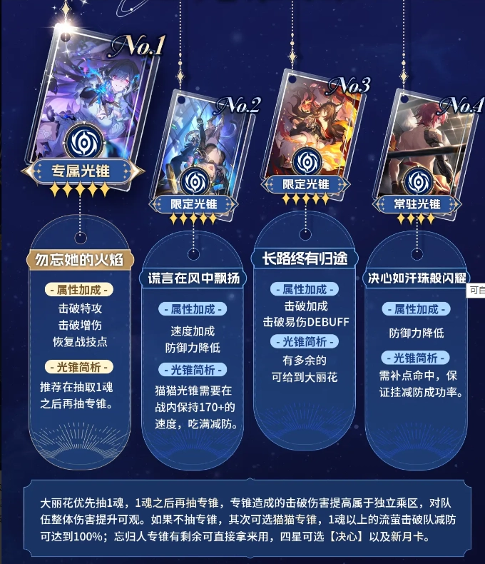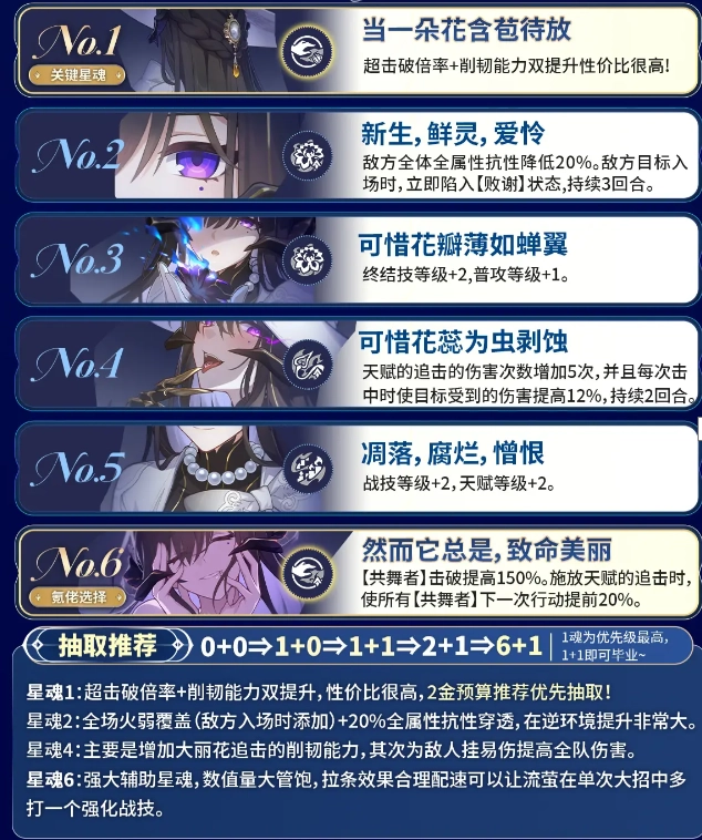 大丽花2金预算优先抽取1魂,超击破倍率+削韧能力双提升,性价比很高;其次推荐再抽取专锥。