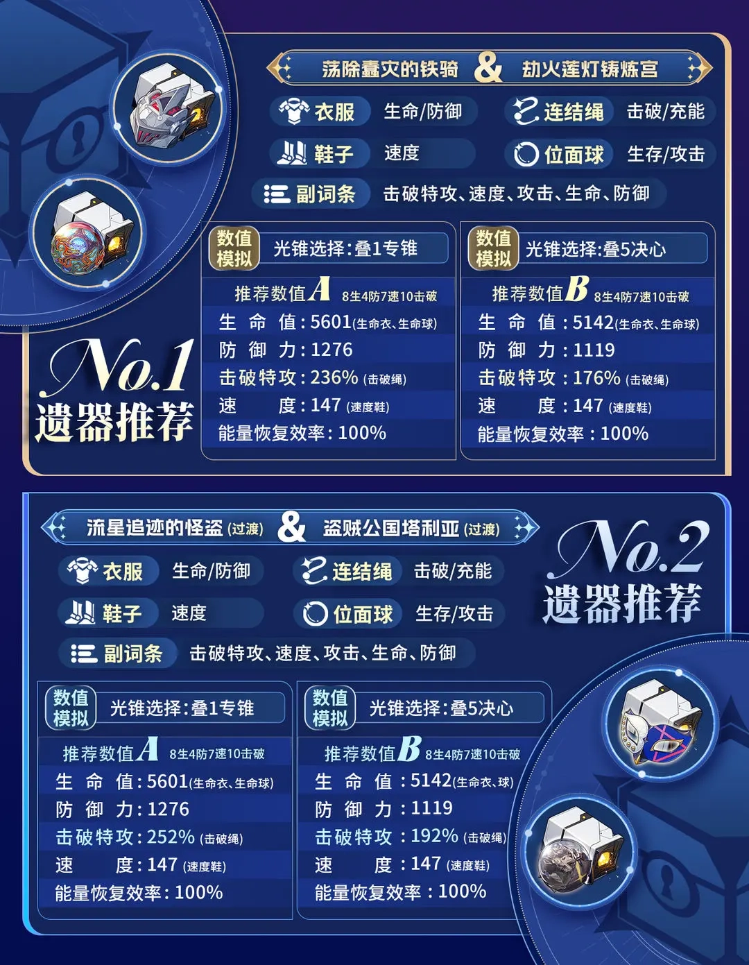 ①外圈遗器建议选择新遗器【荡除蠹灾的铁骑】,其二件套效果为提升击破能力,四件套效果是无视目标防御;不过要想完全触发25%的无视防御效果,需要在战斗中使击破特攻达到250%。