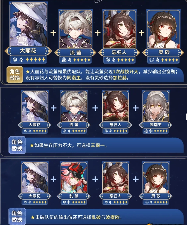 如果生存压力不大的话,也能采用三拐一的搭配(比如流萤、大丽花、忘归人加上同谐主),这种组合的伤害量会更高,应对0T或者短T的情况时优势更明显。