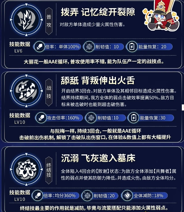 ② 大丽花可为队伍带来多重增益,包括提升50%击破效率、降低敌人18%防御、为全体敌人附加弱点、增强击破特攻以及恢复战技点等效果。