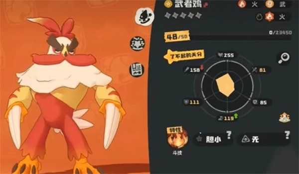 进化完成后,武者鸡被定位成物理输出类宠物,主要依靠火系和武系技能来输出伤害。