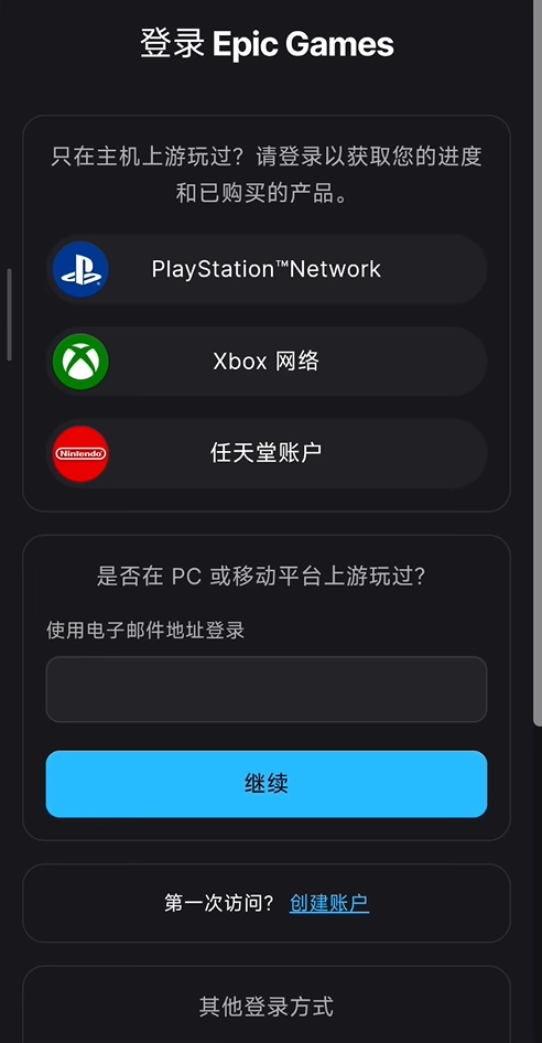 3、若此前未注册过epic账号,可点击创建账户,再通过电子邮箱完成注册