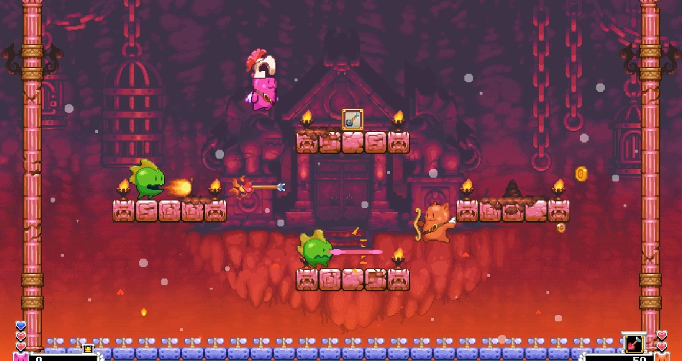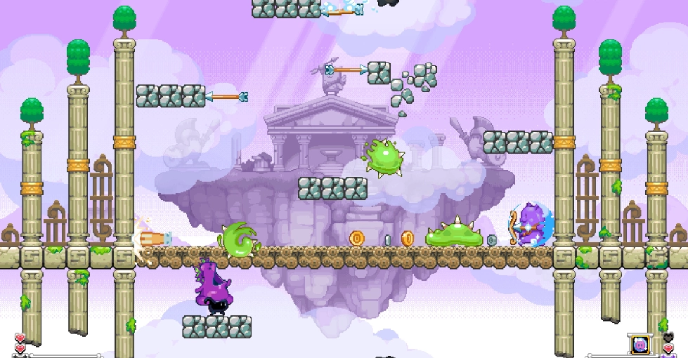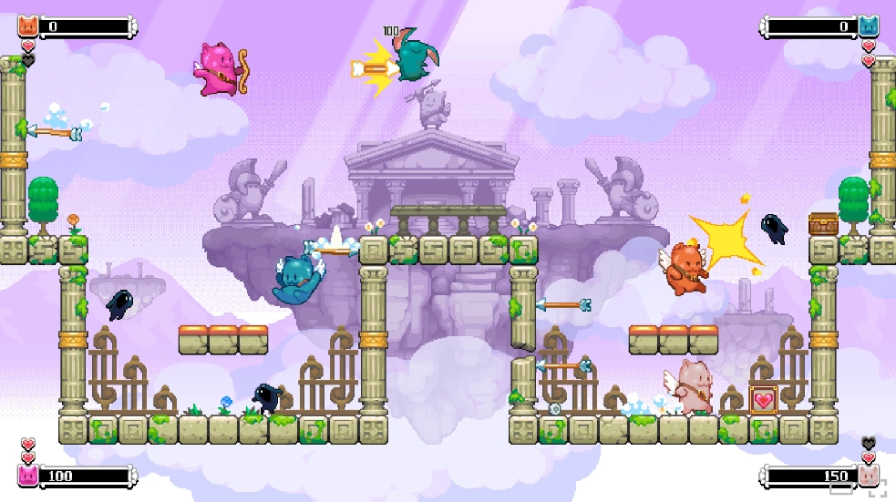这是一款街机风平台跳跃射击游戏,你将化身天使猫猫,拿起弓箭守护家园。