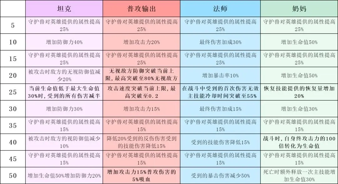 坦克职业在25级解锁的“血量低于30%时获得高额伤害减免”技能堪称质变点,性价比极高,是全队最该优先达成的目标。法师职业的核心技能同样在25级,效果为“免疫首次致命伤害”或“大幅缩减技能冷却”,能明显提升生存能力与爆发频率。普攻型输出英雄的关键技能分布在20级、25级和50级,分别强化破甲、攻速与吸血,属于需要长期投入的类型。奶妈职业的核心技能则在25级和40级,主要作用是大幅提升治疗量以及根据攻击力附加治疗效果。