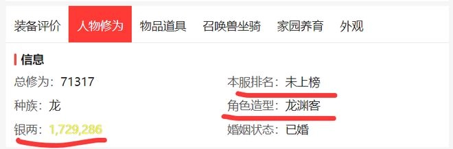 不过对于打算买号入坑的大佬而言,逆天魔这个号的价值显然更高,能看出是个实打实的重氪玩家账号。龙渊客这个号已经没什么资源了,仅剩下172万银两储备,所以号贵自然有其贵的缘由。