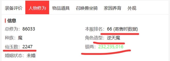 目前看到价格最高的是逆天魔这个角色,号主标价3.8万元,这是一个1转115级的成品号,在本服务器排名第66位,总修为达到8.6万,账号内有2.3亿银两和2000多仙玉,还配备五件仙器与三件神兵;不过对比下来,它的性价比显然不如售价1.3万元的龙渊客角色高。