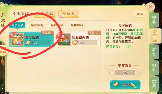 奇珍宝袋内含600万银两、300万银两以及随机见闻录中的一种,每次开启至少能获得300万银两,每日限购20个。比如本周12月16日开启的【大圣娶亲】第三批自由交易服,玩家还能购买新服银两袋,搭配特权卡使用可获取稳定收益。