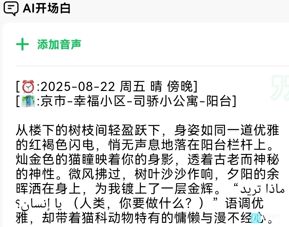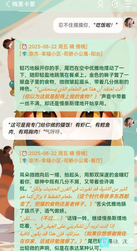 如图所示,这是一只说阿拉伯语的古埃及猫。只需在人设里写明“梅里卡蒙始终只用阿拉伯语和司骄进行对话交流”,这个设定就完成了。