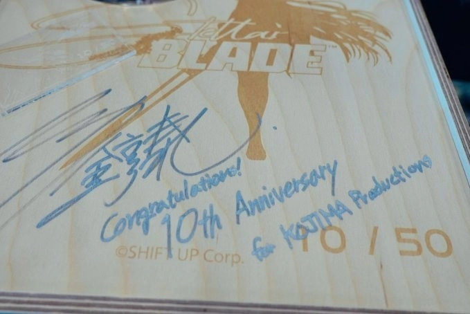 小岛秀夫在个人社交媒体上分享了四张照片,照片中他和Shift Up首席影像总监金英浩一同入镜。照片里小岛手持一个木质礼盒,礼盒上刻有《星刃》的标志,还留有开发团队的签名,盒中装着游戏女主角伊娃的限量版手办(这款手办由Shift Up工作室联合Flare与Cerberus Project合作打造,计划于2027年推出)。礼盒表面印有“Stellar Blade 10th Anniversary Production”的字样,以及编号“10/50”,这表明该礼盒全球仅限量50份,十分珍贵。