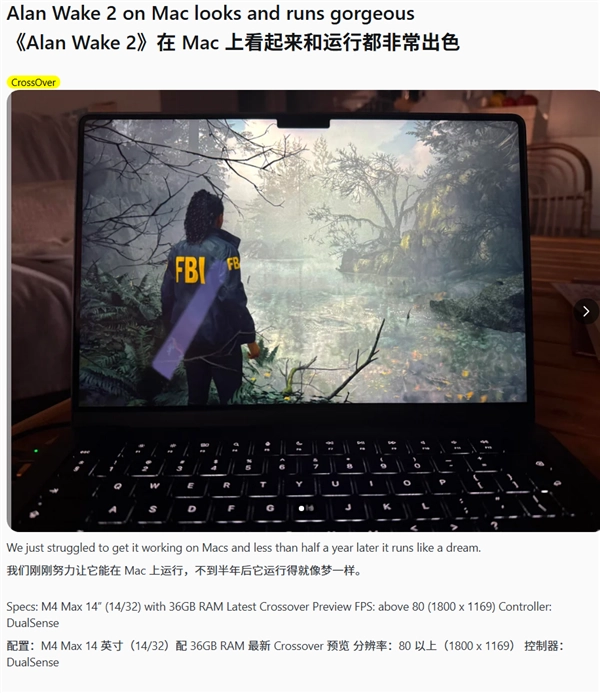 该用户表示,在短短不到半年前,《心灵杀手2》在他的设备上尚无法启动运行,但现在经过CrossOver的优化处理后,这款游戏已经能够正常运行了。