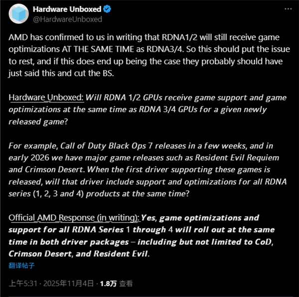 AMD官方发言人在接受媒体询问时最新表态:“针对所有RDNA 1-4系列架构产品的游戏支持与优化,将会同时在驱动中提供,包括但不限于《使命召唤》《生化危机》《红色沙漠》。”