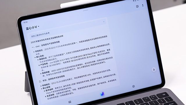 在AI办公场景中,iQOO Pad5e的功能更为丰富——其搭载的蓝心小V已接入DeepSeek R1大模型,借助这一能力,小V写作可根据不同输入场景完成多样化文本创作,像购物评价撰写、社交媒体内容创作等都不在话下,同时还具备文本润色、扩写、缩写等通用处理功能。