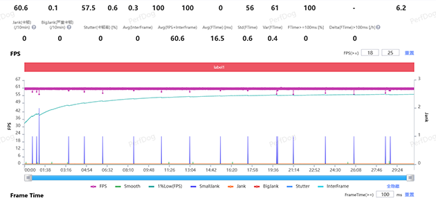 实际游戏表现,《原神》最高画质+60帧,前10分钟平均帧率60.06fps,功耗4.7W;15分钟后帧率波动至55-60fps,功耗攀升至5.7W,最终30分钟平均帧率为xx FPS。