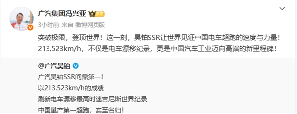 广汽集团董事长冯兴亚指出:“213.523km/h,这一成绩不只是电车漂移领域的新纪录,更标志着中国汽车工业在向高端化发展进程中树立起了新的里程碑。”