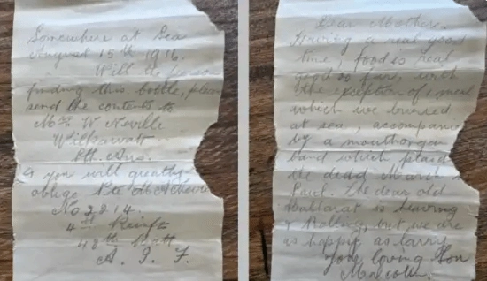 这两封信是两名澳大利亚士兵在乘船前往法国战场的途中写下的。28岁的马尔科姆·内维尔在信里跟母亲说,船上的伙食“特别棒”,他们过得很开心。可几个月后,他就在战场上牺牲了。另一位37岁的士兵威廉·哈利则是给“捡到这个瓶子的人”写的信——因为他的母亲早就不在人世了。