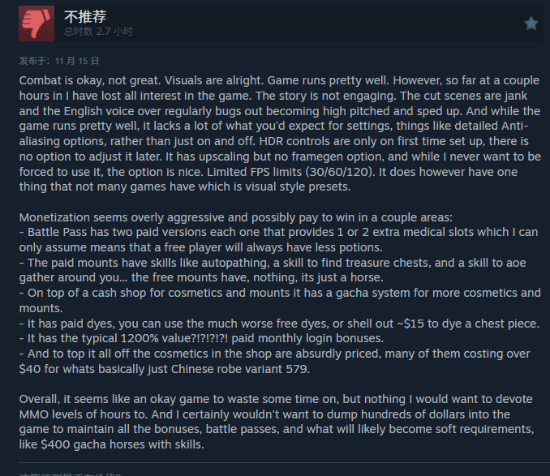 在玩家好评方面,许多人对游戏的流畅运行、爽快战斗体验以及高品质画面给予了称赞。作为一款免费游戏,它被广泛认为“值得尝试”。还有玩家对其内容量表示认可,称“任务数量庞大,支线设计精妙,内容丰富程度远超预期。尽管目前仅游玩了3小时,但能预感到自己会投入上百小时的时间。建议大家耐心跨越前期的门槛。”