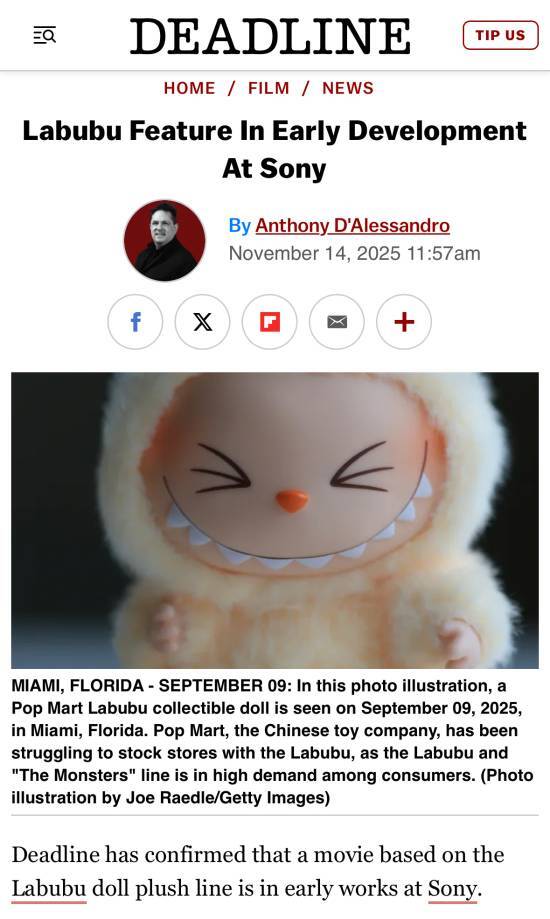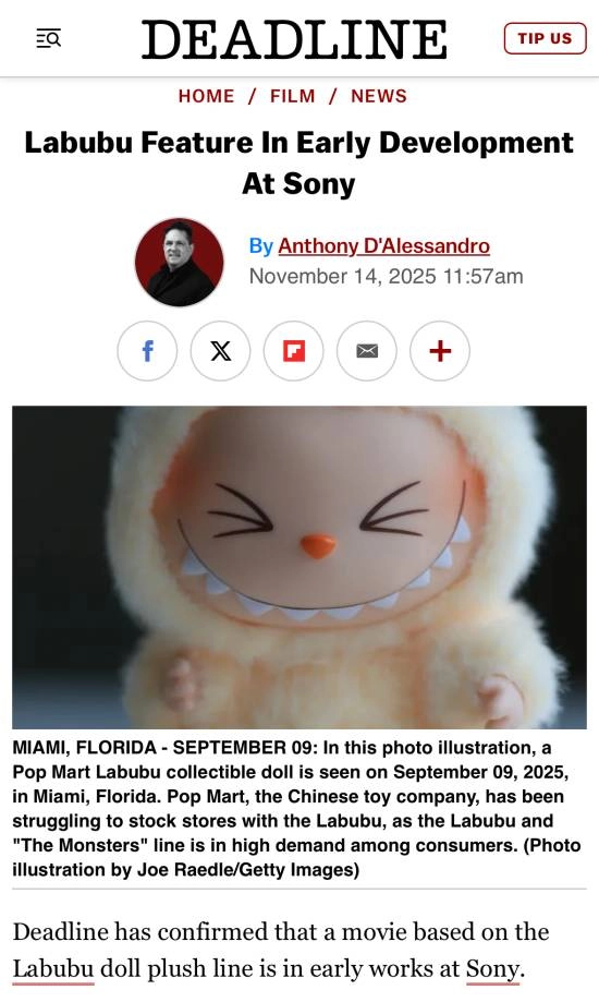 据外媒Deadline消息,索尼已着手筹备开发一部围绕Labubu玩偶展开的电影项目。