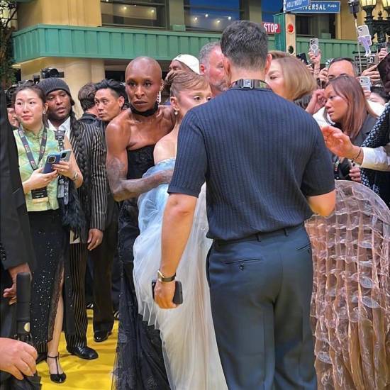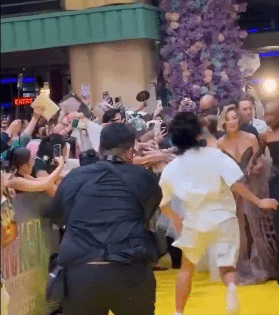 近日,《魔法坏女巫2》新加坡首映礼现场,一名男子翻越围栏,强行上前搂抱Ariana Grande(A妹)。身旁的Cynthia Erivo迅速反应将其推开,杨紫琼等人也随即上前协助,最终该男子被保镖带离现场。