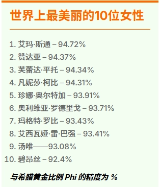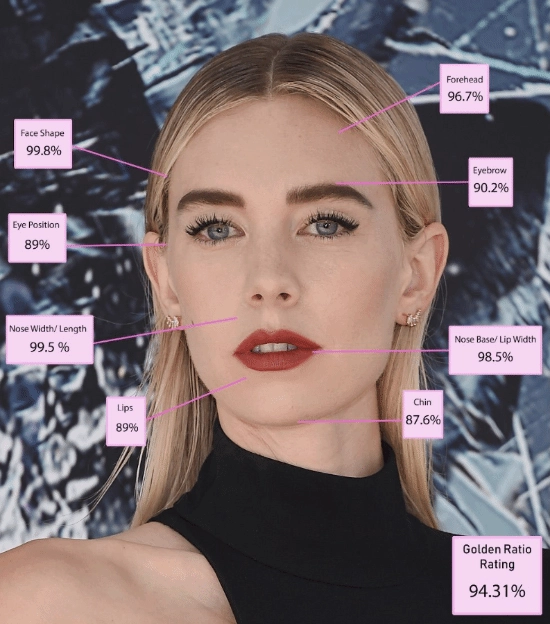 德西尔瓦借助古希腊的“黄金比例”来测算女演员们的五官,结果表明艾玛·斯通的面部比例匹配度达到了94.72%,这一数值让她被视作极度接近“完美脸型”的人。