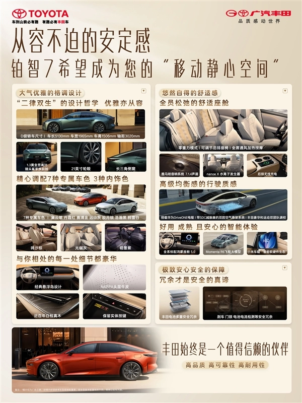 铂智7由丰田中国工程师团队主导研发,最突出的优势是整合了中国多家科技企业的核心技术亮点,它搭载了华为电驱系统与鸿蒙智能座舱,同时接入了小米智能生态,并应用了Momenta提供的辅助驾驶解决方案。