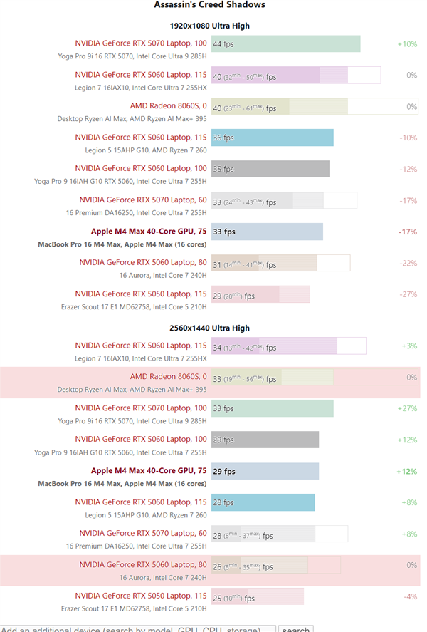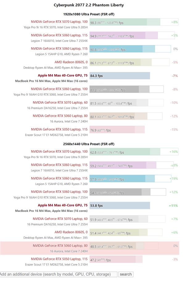 不仅如此,M4 Max甚至能击败部分低功耗版本的RTX 5070移动版,比如戴尔16 Premium所搭载的60瓦RTX 5070。