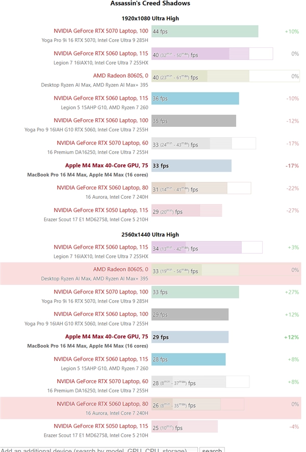 对比M4 Max与Windows笔记本的性能表现,它的性能大致和搭载100瓦TGP的RTX 5060移动版相当,并且可以轻松战胜TGP为80瓦的低功耗版RTX 5060。