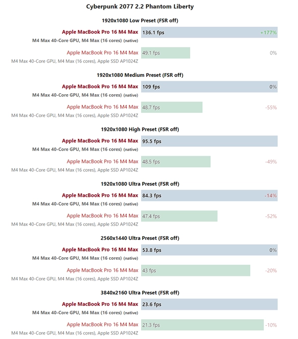 11月21日消息,近期Notebookcheck针对配备苹果M4 Max芯片的MacBook Pro 16英寸机型开展了游戏性能测试,测试所选用的是原生适配macOS系统的《赛博朋克2077》与《刺客信条:影》这两款游戏。