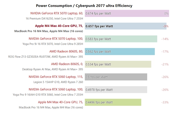 在能效测试环节,原版《赛博朋克2077》的运行效率比模拟版本高出46%;而在游戏能效表现上,搭载苹果M4 Max芯片的设备,相较于性能处于同一梯队的Windows笔记本,几乎胜过了所有同类型竞品。