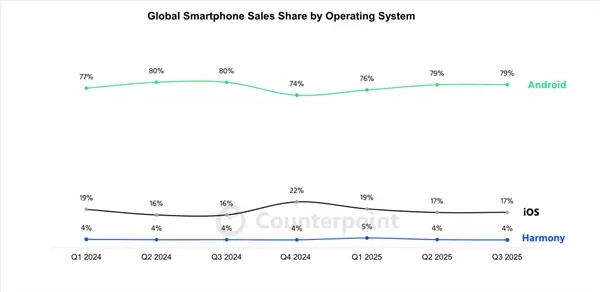 在中国市场,HarmonyOS在第三季度的份额为18%,这一数据使其持续领先于iOS。