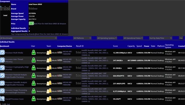 SiSoftware的测试数据表明,Xeon 696X在多媒体基准测试里取得了12389.50 Mpix/s的成绩,和W9-3495X(56核心版本,得分8463.41 Mpix/s)相比,性能提高了46%。