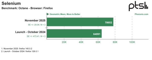 11月28日消息,据专业Linux媒体Phoronix近期实测显示,Intel于去年发布的Arrow Lake系列Core Ultra 200S处理器,经过一年的软件优化后,在Linux平台上的性能取得了显著提升。