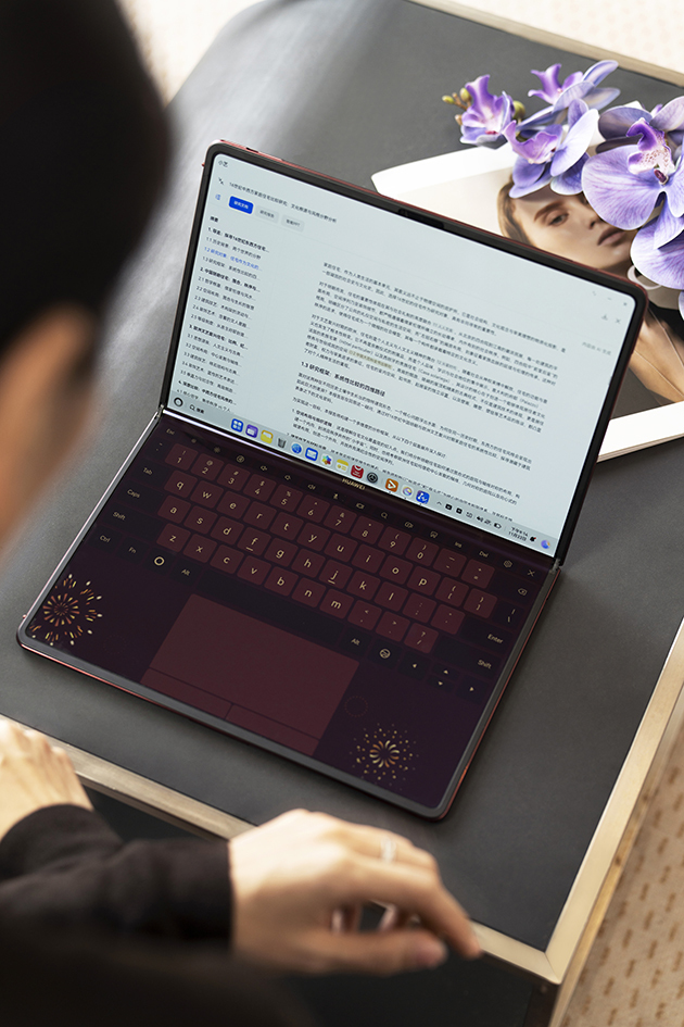 华为MateBook Fold 非凡大师 瑞红的核心优势体现在其独特的“瑞红”配色设计上。这款配色在色彩选择上摒弃了过于张扬的红色调,转而呈现出沉稳且典雅的质感,既留存了东方美学里红色特有的温润气韵,又贴合了现代高端产品的审美标准。此外,产品背面选用了温润的素皮材质,并搭配锦瑞结压纹设计,在当下以黑白为主要色调的PC配色市场中,为用户带来了更具辨识度的个性化选择。同时,其蕴含的“开门红”“鸿运当头”等吉祥寓意,也满足了部分用户对积极心理暗示的期待。无论是商务办公场合还是日常使用场景,这一配色都能很好地适配不同环境,彰显出产品的设计匠心。