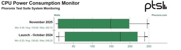 更让人惊喜的是,功耗的降幅达到了15%之多,平均功耗从136.8W降到了116.9W,峰值功耗则保持在250W上下。