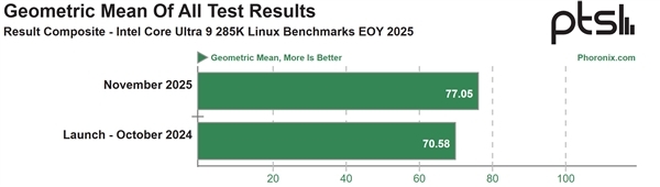 Phoronix对酷睿Ultra 9 285K在去年10月与今年11月期间于Linux系统中的运行表现进行了对比。