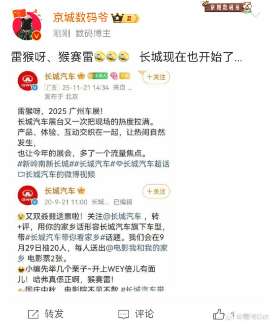 近日,长城汽车在2025广州车展的宣传内容以“雷猴呀”作为开场,不料该内容引发部分网民的攻击,最终不得不删除相关帖子。