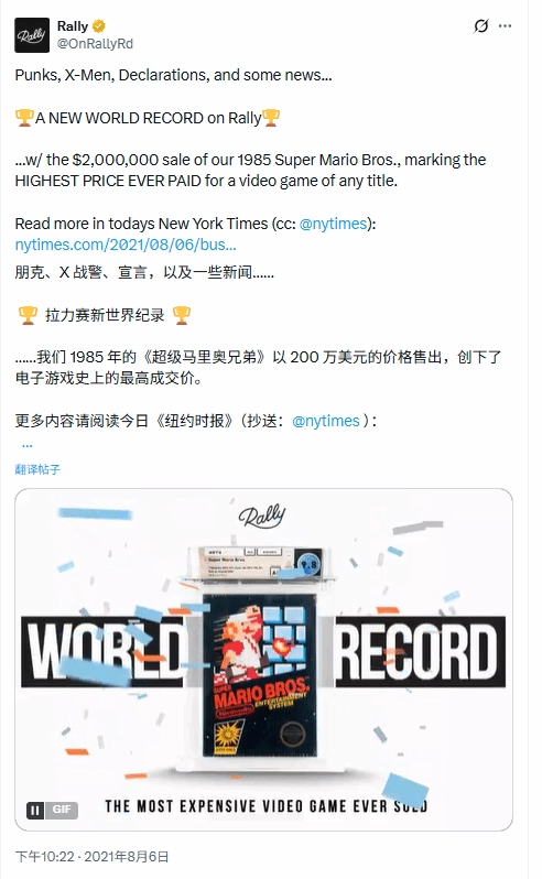 当然,电子游戏作为收藏品能拍出高价早已不是新鲜事,而且整体来看,42500美元的价格和其他拍卖成交价相比实在是不值一提。2021年时,就有一款全新未拆封的《超级马里奥兄弟》以200万美元的价格成交,创下了当时的纪录,不过对于这笔交易是否属于传统意义上的拍卖,外界仍有不同看法。而吉尼斯世界纪录认证的电子游戏最高成交价,则是一款以156万美元售出的《超级马里奥64》。只是谁也说不准,百年之后,那版《堡垒之夜》又会价值几何呢?