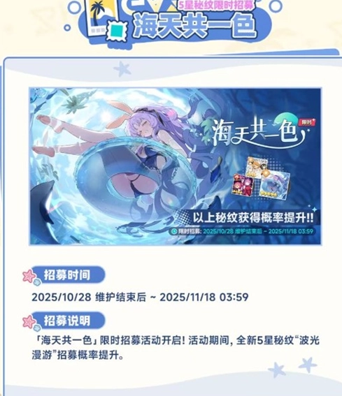 活动说明:全新5星秘纹“波光漫游”招募概率提升。
