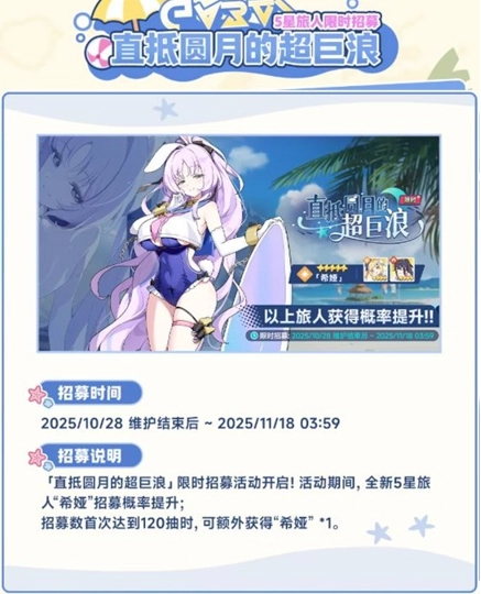活动说明:全新5星旅人“希娅”招募概率提升;招募数首次达到120抽时,可额外获得“希娅”*1。