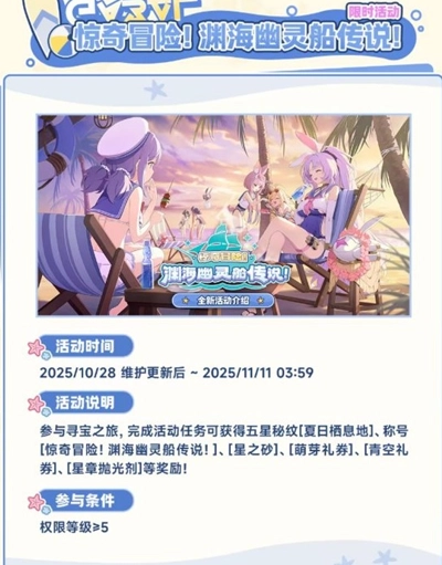 活动说明:参与寻宝之旅,完成活动任务可获得五星秘纹[夏日栖息地]、称号[惊奇冒险!渊海幽灵船传说!]、[星之砂]、[萌芽礼券]、[青空礼券]、[星章抛光剂]等奖励。