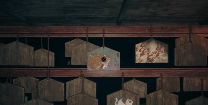 猫御守木牌的位置在普通文档5背后的木架旁,再往左边的木架上,就能找到带有猫图案的木牌。