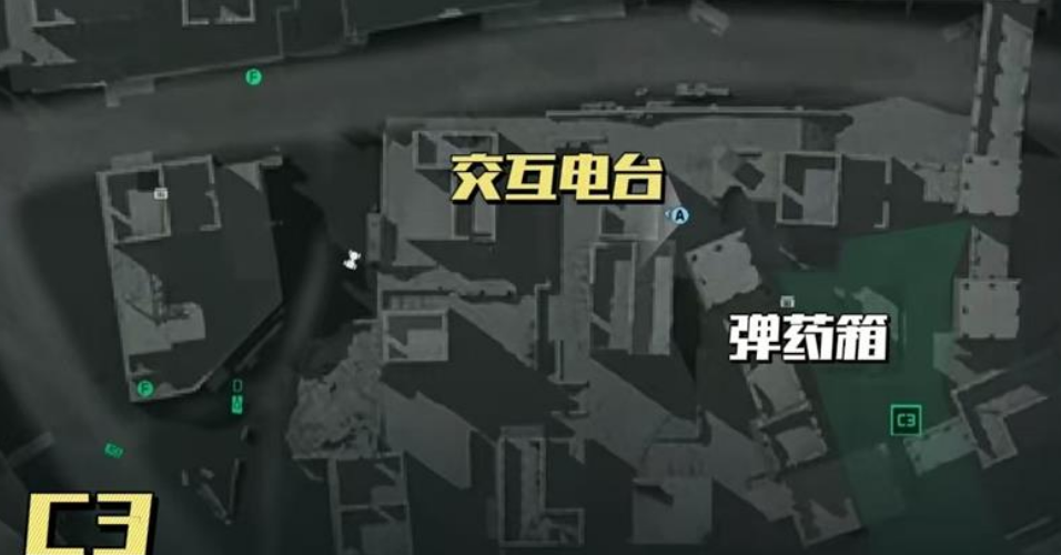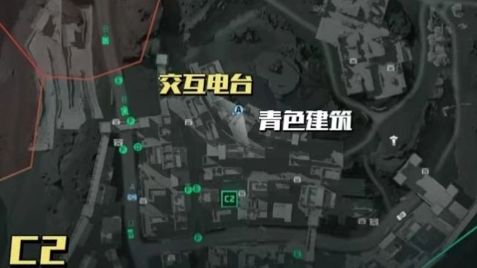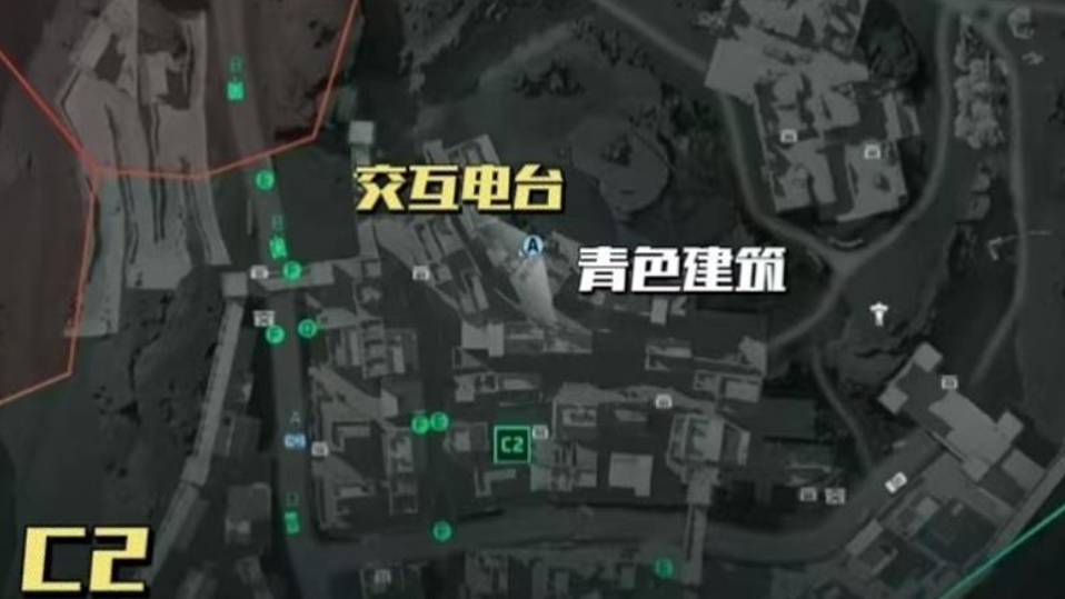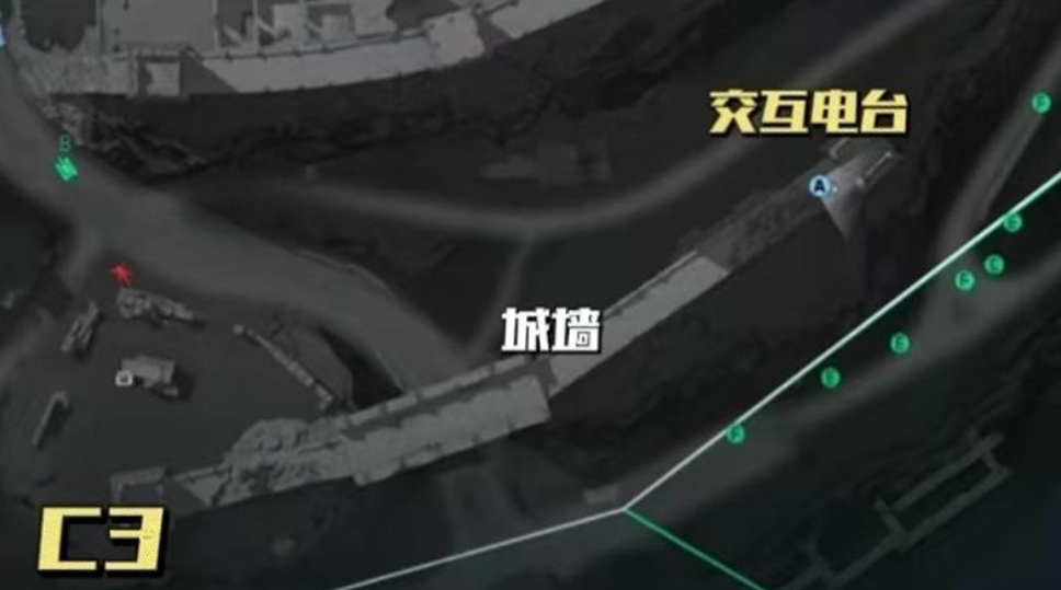 C2上方的电台位于C区和E区的交界地带,标志性建筑是一座醒目的青绿色房屋。靠近这座建筑后,从它的左侧山坡向上攀爬,在屋檐与坡地衔接的角落处就能找到目标电台。C3右下方的电台处于城墙的末端位置,顺着墙体一直往前走,最后会在一座坍塌的高塔前看到设备。另外,C3重生点附近也设有一个电台,需要跳上箱子进入破损的墙体,再爬到屋顶的小门前,电台就在门旁边,尽管途中会出现脱离战场的提示,但不会对交互操作造成影响。