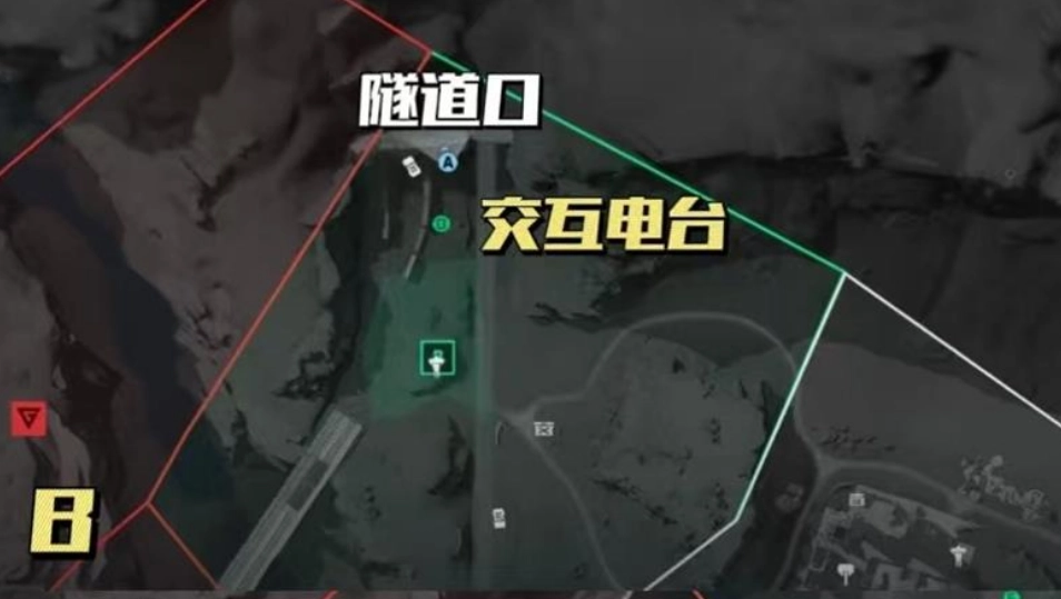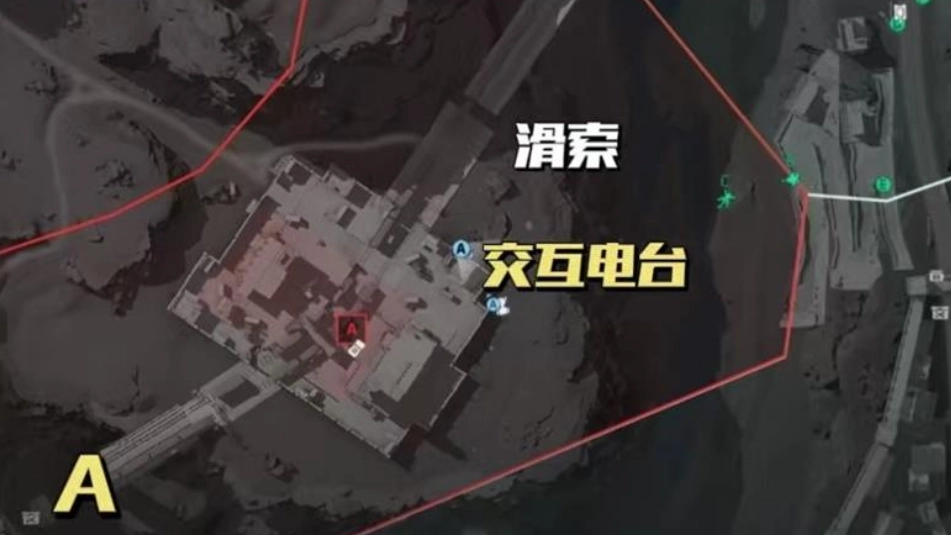 周边的分散点位散布在地图的各个角落。B区域的电台藏在最上方隧道口右侧的隐蔽角落里,不过它比较显眼,很容易被发现。A区域的电台则需要从悬崖边通过滑索下降,进入山洞后一直往前走,最后在一片由集装箱和铁网围起来的异常区域里找到,目标就放在一个位置较低的集装箱上。这两个点位定位起来相对简单,适合用来快速推进任务进度。