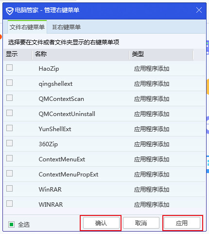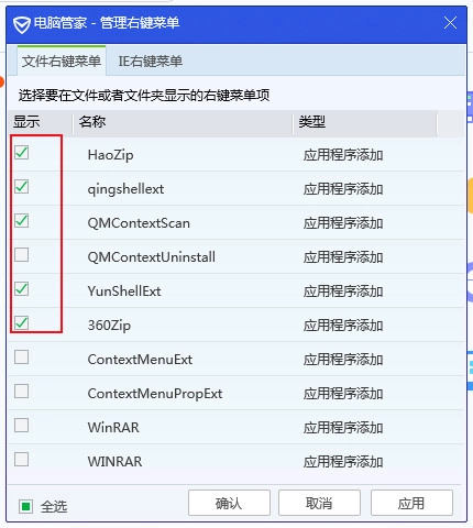 然后在弹出的窗口界面里,右键菜单中显示出来的软件都处于已选中状态,没显示的软件则是未选中状态,大家可以按照自己的使用需求来进行选择和设置。