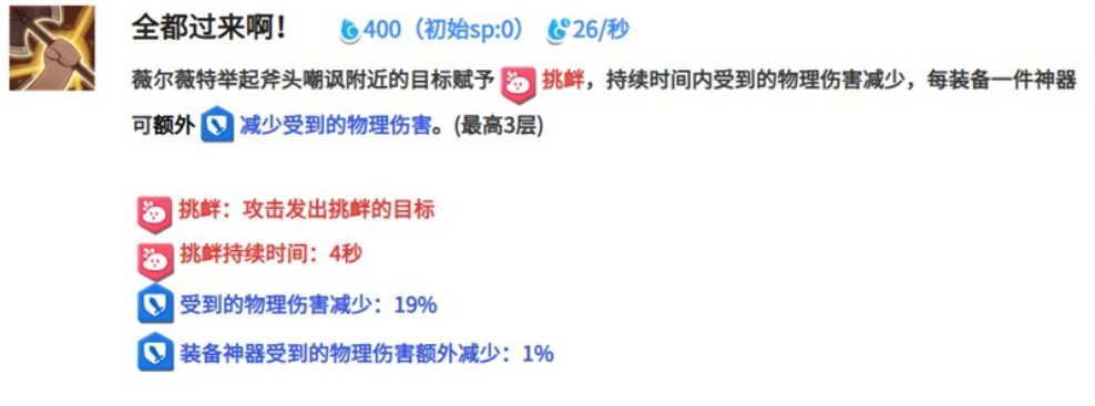 薇尔薇特的核心技能之一,初始状态下可对附近单个敌人造成斧击伤害,并附加一层持续4秒的挑衅效果。处于挑衅状态期间,她自身受到的物理伤害会明显降低。每装备一件神器,该减伤效果最多可叠加至3层,从而进一步增强她在战场上的生存能力。凭借这一机制,薇尔薇特在应对高物理输出敌人时拥有更强的抗压能力,尤其适用于持久战场景。