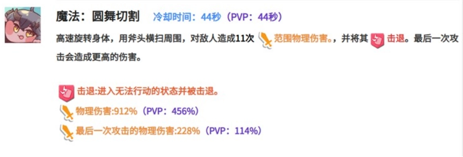 薇尔薇特的另一项主动技能,释放时会高速旋转并挥动斧头横扫周围敌人,总共造成11次物理伤害。该技能的最后一击伤害最高,物理伤害倍率可达912%。完成连击后还会触发击退效果,让被命中的敌人在短时间内无法行动。这一技能在清理杂兵和打乱敌方节奏方面表现出色,是她在PVE模式中发挥优势的关键所在。