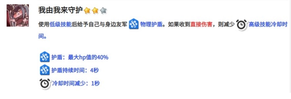 “由我来守护”技能生效后,会为自身与周围队友生成一个物理护盾,其数值等同于使用者最大生命值的40%;此外,在承受直接伤害时,该技能还能使大招的冷却时间缩短1秒。