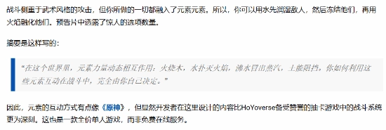 所以,元素之间的互动机制和《原神》有几分相似,但很明显,开发者这次所构建的内容,在深度上超越了米哈游那款备受赞誉的游戏的战斗系统。另外,这款游戏是定价合理的买断制单人作品,并非免费游玩、长期运营的服务型游戏。