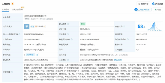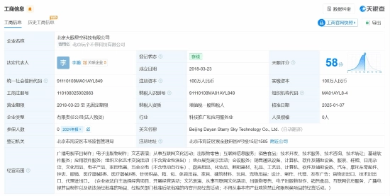 根据天眼查信息,北京大眼星空科技有限公司于2018年注册成立,该公司法定代表人为李瀚,注册资本为100万元人民币。