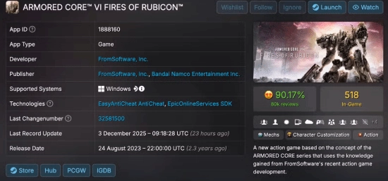 当然,SteamDB上显示的更新数据并非每次都代表游戏会新增内容。有些时候所谓的“新内容”仅仅是补丁程序或者商店页面的刷新操作,这类情况也需要对PC端的文件进行更新。但即便如此,《装甲核心》的粉丝们依旧怀揣着些许期待,盼望着这次的更新不会让他们空欢喜一场。